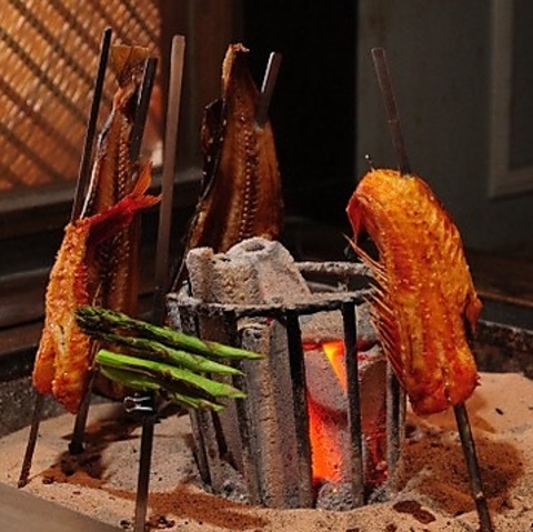 炭火でじっくり焼き上げることで、香ばしさが引き立ちます。魚や海老などはもちろん、肉や野菜なども焼き上げます。