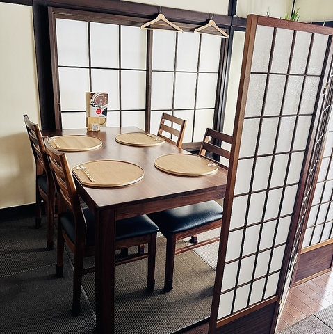 4名様向けのテーブル席が4席ございます。ご友人やご家族と一緒に、リラックスした雰囲気の中でお食事をお楽しみいただけます。ぜひ、特別な時間を当店でお過ごしください。