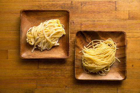 店内で作っている福岡県産小麦100%のパスタ。ソースや種類によって変えております。