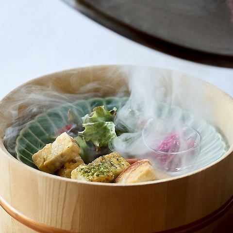 ふたを開けた瞬間、白い湯けむりがふわりと立ちのぼり、目の前に小さな舞台が広がります。蒸気がゆらめきながら食材を照らすように包み込み、まるで“見て楽しむ料理”のようなひとときに。食事の始まりを、目で感じる華やかさとともにお届けします。