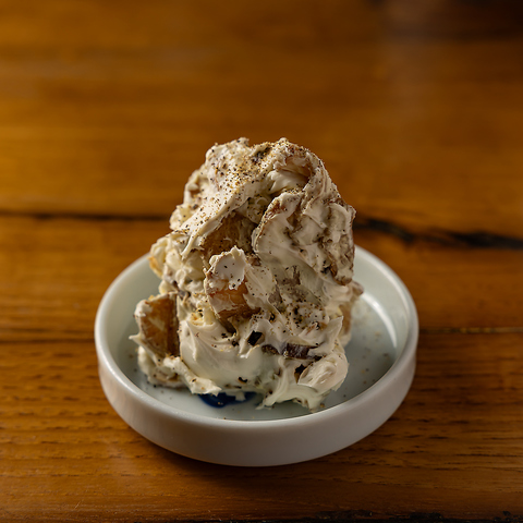 燻した薫り豊かないぶりがっこに、なめらかでコク深いマスカルポーネを合わせた人気の組み合わせ。燻香とミルキーな甘みのバランスが絶妙で、日本酒・焼酎・ハイボール全てと好相性。軽いおつまみとしても、シェアしても楽しめる一皿。