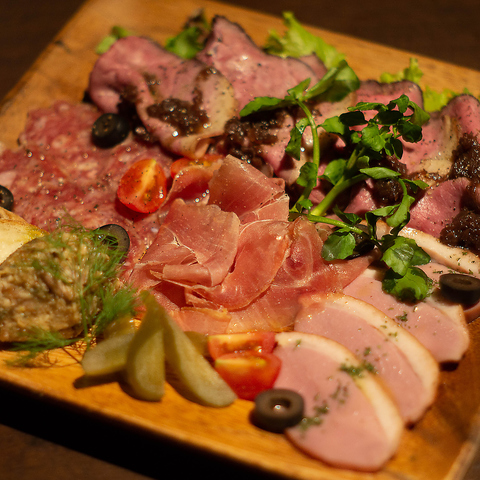 ハム・リエット・サラミ・生ハムなど、ボリュームがあって楽しめる盛り合わせです。ワインやビールなどお酒によく合い、フランス定番のおつまみとして人気のメニューです。