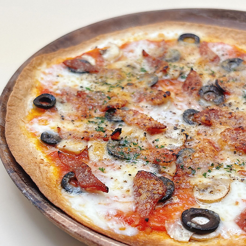 中央に玉子を乗せ、黒トリュフをふんだんに使用した贅沢なピザ。とろ~り濃厚なチーズに、生地は薄めのパリッとした食感が楽しめる、絶妙な焼き加減でご提供しております。