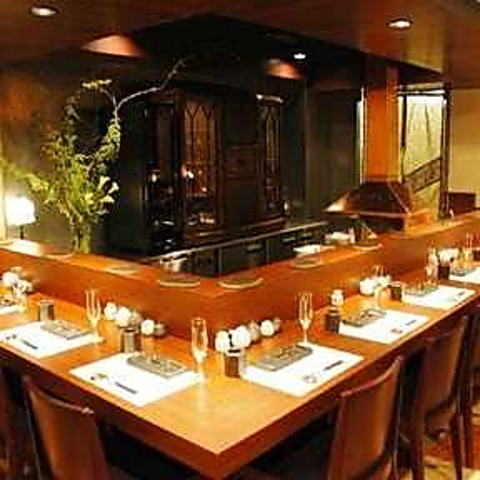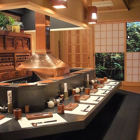 窓の外に広がる美しい日本庭園を眺めながら、ゆったりと食事を楽しめる掘りごたつ式のカウンター席が魅力です◎12名様までの貸切にも対応しており、開放感と和の情緒が融合した贅沢なひとときを演出します♪季節ごとに表情を変える庭を愛でながら、足を伸ばしてリラックスできる、至福の特等席です◎ぜひ、ご利用ください。