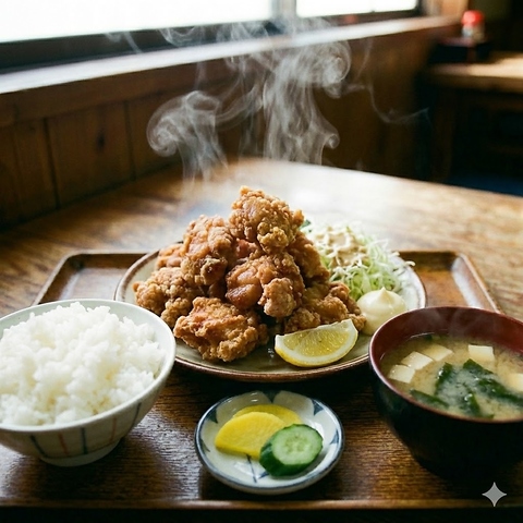 ランチの定番として自信を持って提供する看板メニューです◎大ぶりの鶏肉を独自の味付けで漬け込み、高温でカラッと揚げ上げました。外は香ばしく中は驚くほどジューシーな仕上がりです!ご飯や小鉢も付いてボリューム満点。午後の活力になること間違いなしの絶品定食を、お昼時にぜひ一度お試し。 ※画像はイメージです