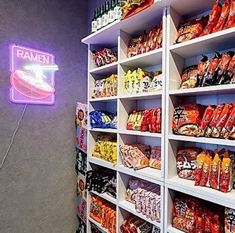 選べる韓国袋麺。ずらりと並んだラーメン棚からお好きな一杯をどうぞ。