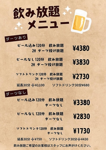 「投げ放題飲み放題コース」は、ダーツを楽しみながらお得にドリンクを満喫できる特別なプランです◎人数やシーンに合わせて柔軟に対応でき、1人からでも利用できる気軽さも魅力。幅広いメニューと組み合わせて、思い出に残る楽しい時間をご提供します★気軽さと楽しさを両立した空間で満足度も高まります!