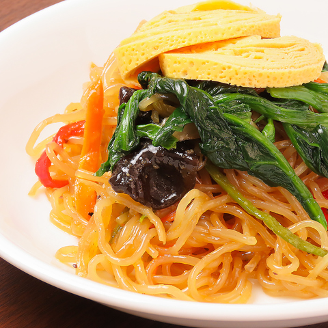 春雨と野菜を醤油ベースで炒めた韓国の定番料理。