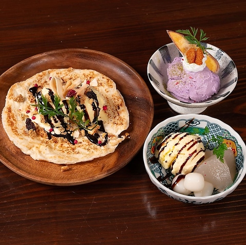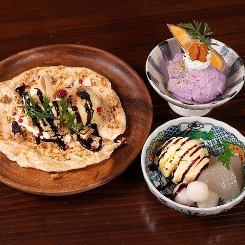 程よい甘さが心もお腹も満たしてくれるデザートもご用意しております!「紅芋のパンナコッタ」はお芋のまろやかな味わいに季節を感じる逸品。「白玉わらび餅の雪見アイス」はモチモチ食感が楽しく、冷たいアイスが口いっぱいに広がる当店定番デザート♪男性からのご注文も多い一皿です!