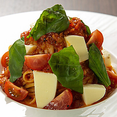じっくり煮込んだトマトソースにとろーりモッツアレラチーズ。バジルの香りを添えて。