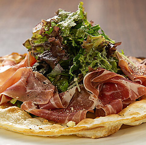 さっぱりとしたドレッシングがピッツァと好相性。生地でサラダを包んで召し上がれ。