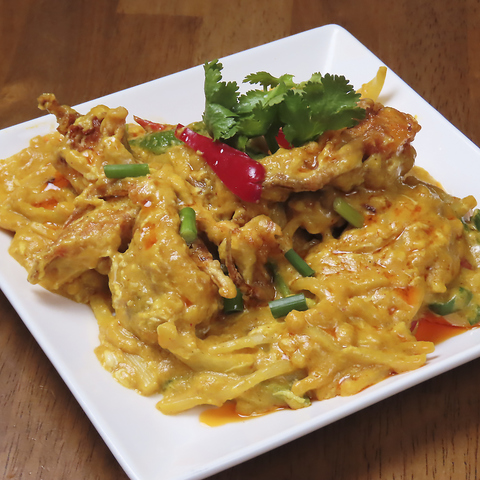プーパッポンカリーは、基本となるカレーペーストからすべてお店で手作り。スパイスの配合や炒め加減まで丁寧に仕上げ、蟹の旨みを最大限に引き出しています。ふんわり卵と濃厚なソースが絡み合い、一口ごとに深いコクと香りが広がる贅沢な一皿。ご飯との相性も抜群で、最後まで飽きずに楽しめます。
