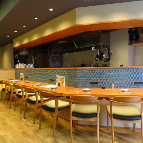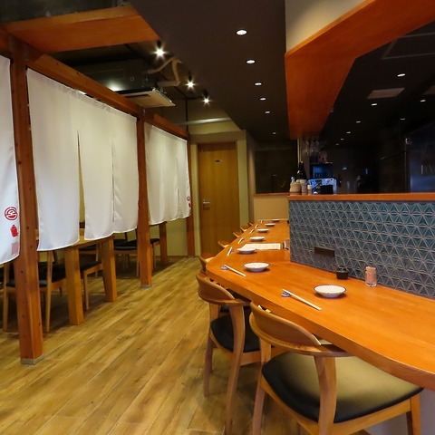 温かみのある照明が店内を優しく照らし、落ち着いてお食事を楽しめる雰囲気を演出しています♪お一人様でも気兼ねなく過ごせるカウンター席から、グループで賑わえるテーブル席まで完備。デートや接待、大切な友人との会食など、どんなシーンでもゆったりと寛げる心地よい空間作りを大切にしています◎