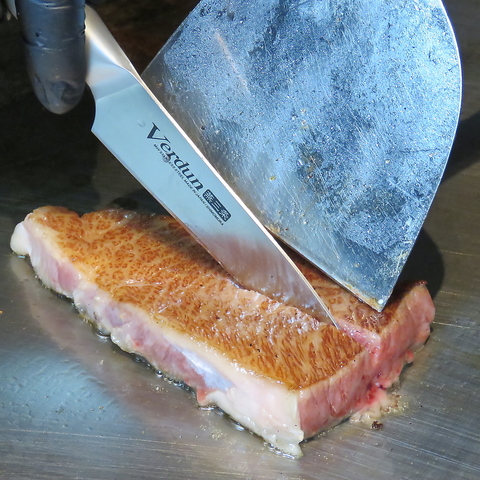 オープンキッチンに面したカウンター席は、まさに特等席です。目の前で豪快に焼き上げられる鉄板料理の音や香りを、五感でダイレクトに楽しみながらお食事していただけます。木の温もりを感じる居心地の良い空間で、熟練の技を眺めながら、贅沢な大人のひと時をお過ごしください。