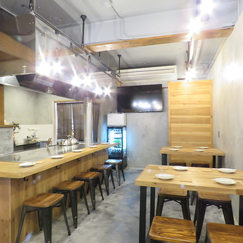 グレーの壁と木目調のインテリアが調和した、お洒落で開放的な空間が魅力です。温かみのある照明が照らす店内には、ライブ感溢れるカウンター席と、グループで寛げるテーブル席を完備しています。肩肘張らずに本格的な鉄板料理とお酒を楽しめる、大人の隠れ家のような一軒です。