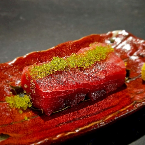 山芋料理を多数ご用意しておりますが、それ以外の一品にも店主のこだわりが光ります。おすすめは<鮪の昆布〆>です。質の良いマグロの赤身を丁寧に昆布で〆て寝かせ、旨みをぎゅっと引き出しました。お塩を振ってお出ししますので、添えた緑色のとびっこ(ワサビ風味)と一緒にお楽しみください。日本酒との相性も抜群です。