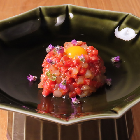 表面をさっと炙ることで、肉の香ばしさと旨みを引き出した贅沢な一皿。中はとろけるように柔らかく、濃厚な卵黄と特製ダレが絡み合い、コク深い味わいに仕上げました。炙りならではの香りと、ユッケのなめらかさを同時に楽しめます。