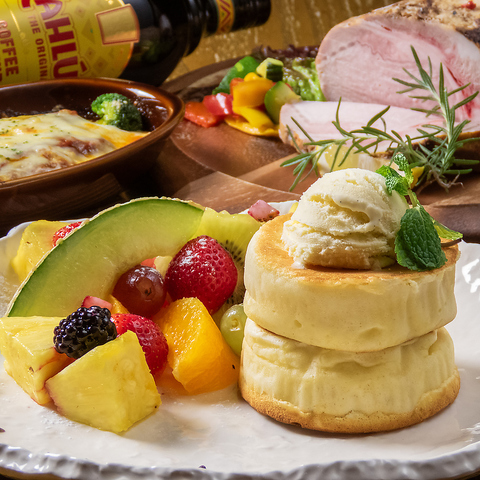 フルーツたっぷりのパンケーキ付きのお祝いコース◎送別会にもおすすめです。日~木は3900円→3700円(税込)に!自家製ローストポークやラザニア風グラタンなど人気メニューも盛り込んだ充実内容♪
