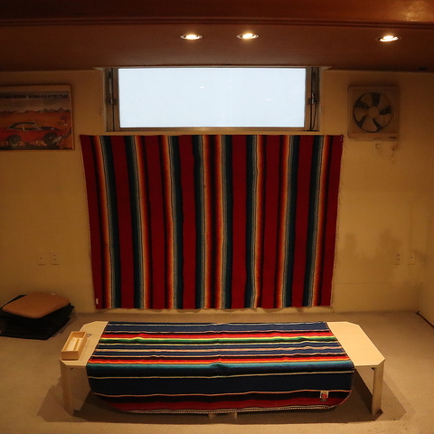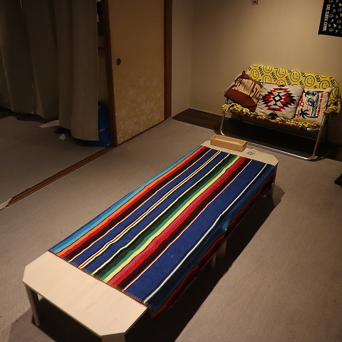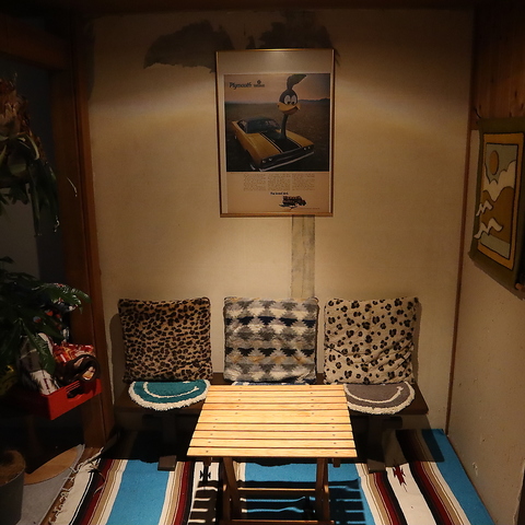 都会の喧騒を忘れさせてくれる、心地よいテキスタイルに囲まれた奥のお座席。 開放的なカウンター席とは対照的に、こちらのコーナーではプライベート感のある落ち着いた時間をお過ごしいただけます。エキゾチックな装飾が醸し出すワクワク感は、スパイス料理のコースを愉しむグループ様のお集まりに最適です。