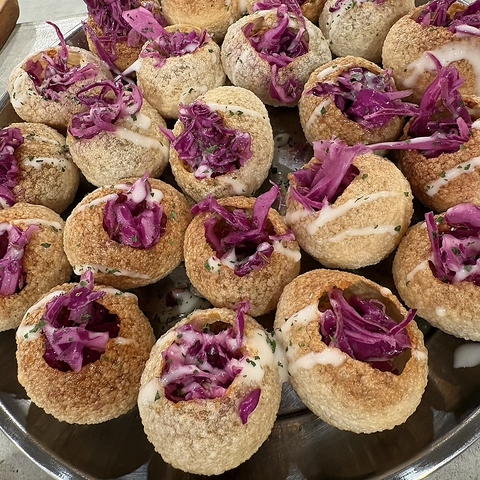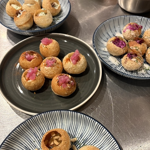 UCHEE Spice Kitchenに来たら、まずはこれ! 自分でスープを注いで一口で頬張る「パニプリ」!インドの定番おやつ「パニプリ」を、UCHEE Spice Kitchen流で。見た目はコロコロと可愛いピンポン玉サイズの揚げ菓子。 その中には、スパイシーなポテトや豆がぎっしり。カリッとした食感のあと、スパイススープが口の中で弾ける感覚がたまらない…!