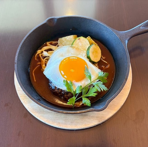 白老牛と黒毛和牛をミックスした、肉汁あふれる特製ハンバーグです!とろ~り重なる目玉焼きを絡めれば、さらに濃厚でリッチな味わいに♪一貫生産だからこそ実現できる、鮮度抜群な肉の旨みを熱々の鉄板で◎大人から子供までみんなで楽しめる...創業当時から変わらない味をご堪能ください♪