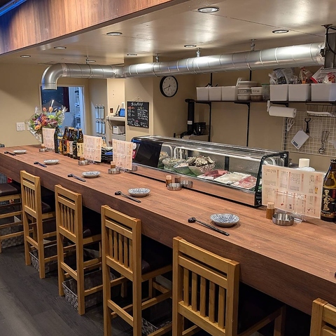 木の温もりが心地よいカウンター席は、目の前のネタケースに並ぶ新鮮な食材を眺められる特等席です◎画像からも伝わる清潔感のある空間で、スタッフとの会話を楽しみながら、炭火の香ばしい香りに包まれる至福のひとときを過ごせます♪お仕事帰りのサク飲みやデートなど、自分へのご褒美にぜひご利用ください☆