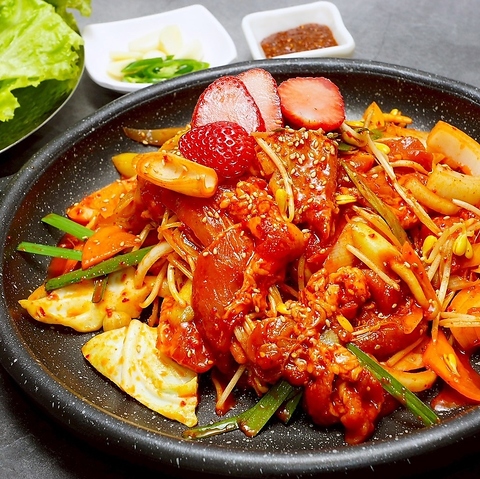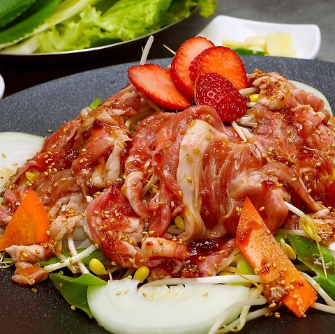 砂糖や調味料に頼らず、いちご本来の甘みと香りだけで仕上げた新しいサムギョプサル。豚肉の旨味をやさしく引き立て、甘酸っぱさとコクが絶妙に調和します。脂っこさを感じにくく、野菜とも相性抜群。さっぱりしながら満足感も高く、最後まで飽きずに楽しめる当店オリジナルの一皿です。