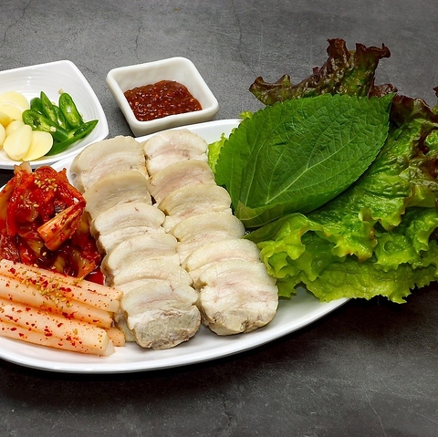 厚切り豚肉を豪快に焼き、旨味を閉じ込めた本場仕込みのサムギョプサル。野菜と一緒に楽しむ満足の一皿。