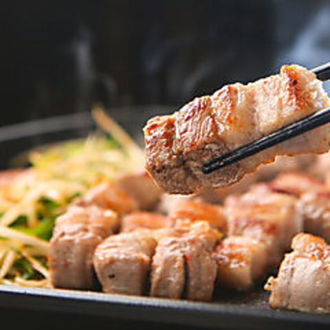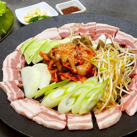 厚切り豚肉を豪快に焼き、旨味を閉じ込めた本場仕込みのサムギョプサル。野菜と一緒に楽しむ満足の一皿。