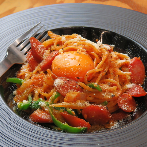 【大盛りプラス200円(税込)】カフェの定番商品、ナポリタン。定番だからこそ、本当に美味しいと思えるナポリタンを追求して作りました。卵黄を混ぜ合わせて食べるとクセになります。