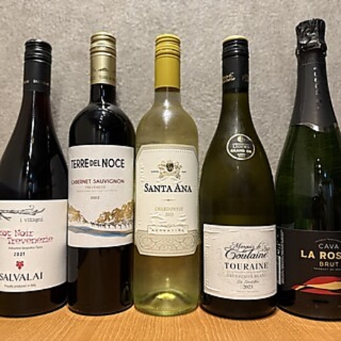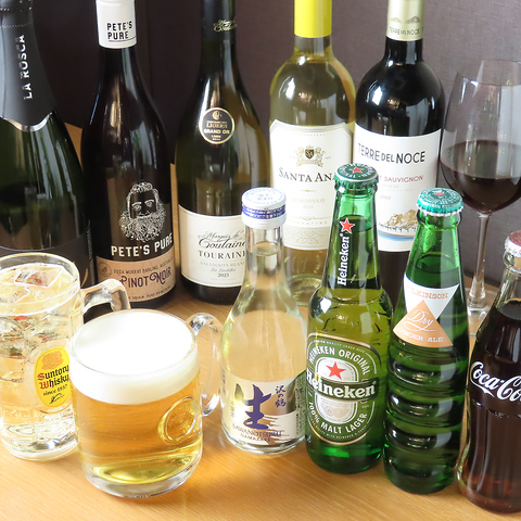 当店の料理と相性の良いワインとビールをお楽しみいただけます♪赤・白のボトルワインはそれぞれ2種類ずつ、グラスで楽しめるハウスワインもご用意。さらに、キリンハートランドの生ビールを取り揃えております。お酒のおつまみにピッタリの一品メニューも充実♪サク飲みや各種小宴会も大歓迎です◎
