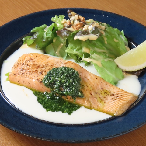鉄板で焼いたサーモンをレモンクリームソースとパセリソースでお召し上がりください。サーモンの身はとろけるようなふんわりした食感に仕上げています。爽やかなレモンクリームソースと、香りの凝縮されたパセリソースの二重奏がサーモンの旨味を最大限に高めます。