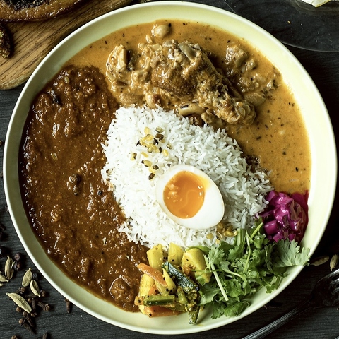 月替わりのスパイスカレー。3種のあいがけでも1種でもお楽しみいただけます。