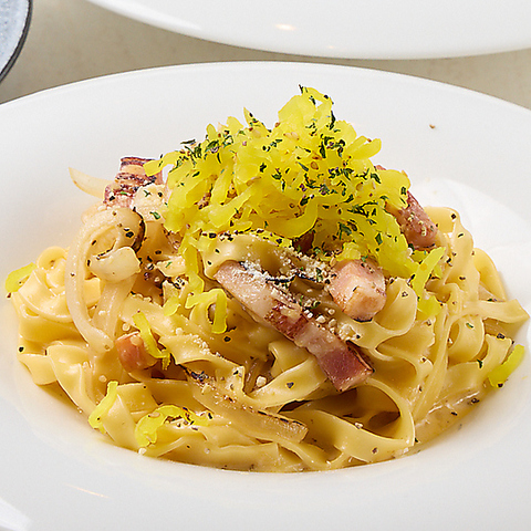 「淡路製麺」の麺を使用した当店自慢のパスタ!独自の風味が楽しめる「たくあんカルボナーラ」、ぷりぷりのエビとトマトの「クリームパスタ」、海の幸の旨み満載の「ボンゴレビアンコ」など、一度食べたら忘れられない美味しさが勢ぞろい♪ぜひ一度ご賞味ください!
