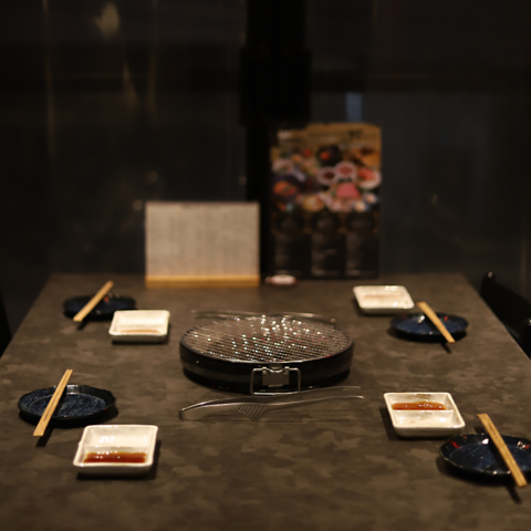 テーブル個室は4名掛け×1卓。卓上ロースターで手元が広く、資料や贈答品も置きやすい配置。接待や同伴、商談後の会食に重宝。静かな空間で、部位の説明も落ち着いてご案内できます。