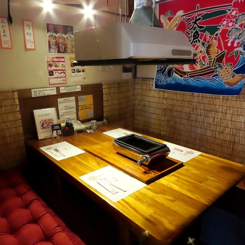 【完全個室席】6名様までゆったり座れる完全個室を4部屋ご用意しております。小さなお子様連れのご家族も、個室なら周りのお客様を気にせず安心してお食事が楽しめます。焼肉やセルフ焼き鳥を囲みながら、プライベートな空間で賑やかな団らんのひとときを。週末や記念日のお食事にも最適な、大人気のプライベート空間です。