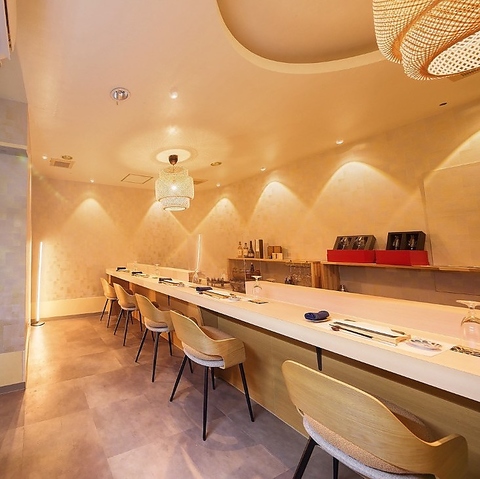 柔らかな提灯の灯りが映える、落ち着きと上質さを兼ね備えた和モダン空間。木の質感を生かしたカウンター席では、職人の所作や料理が仕上がる瞬間を五感で堪能できます。程よい距離感と静けさが心を解きほぐし、一人の贅沢な時間から特別な日の会食まで幅広く対応。洗練された設えが、大人のひとときを静かに彩ります。