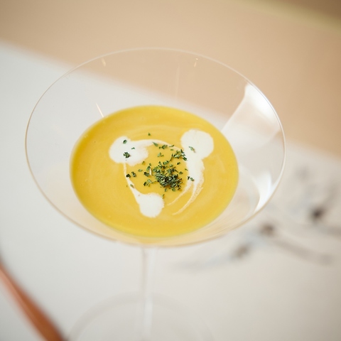 職人が目利きで厳選した南瓜のみを使用し、その甘みと香りを最大限に引き出しました。丁寧にローストして旨味を凝縮させたのち、なめらかに仕立てることで、南瓜本来の濃厚なコクが際立つ冷製スープに。ひと口含むたび、深い甘みとまろやかな余韻が広がる、季節を彩る上質な一杯です。
