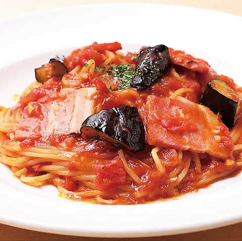産地までこだわったトマトをじっくり煮込んだ特製ソースが、パスタに絶妙に絡む。ぶつ切りナスと厚切りベーコンの食感がアクセントとなり、豊かな風味が楽しめる一品!
