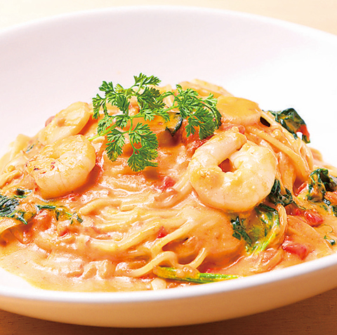 皆が大好きなトマトクリーム!ぷりぷり海老との相性抜群!/樽生ワイン専門ソムリエ推奨:レガンディーノ(ロゼ泡)/シャルドネ(白)