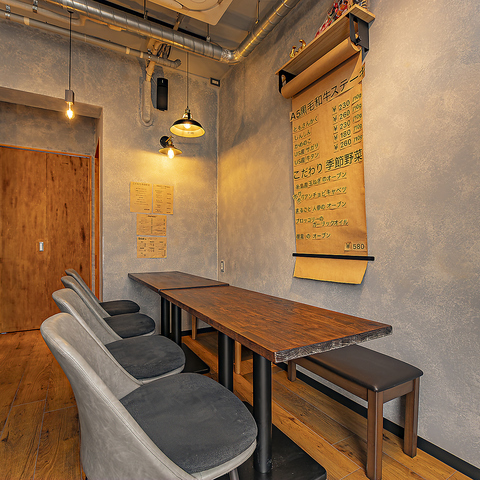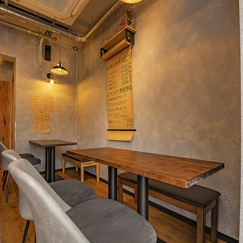 ≪カジュアルな飲み会や女子会に最適◎≫コンクリート調のライトグレーの壁に囲まれた落ち着いた空間で、気軽に楽しめるテーブル席をご用意。少人数での利用はもちろん、連結すれば最大8名まで対応可能◎ワインも充実しており、女子会やカジュアルな飲み会に最適◎おしゃれな雰囲気で、特別な時間をお過ごしください。