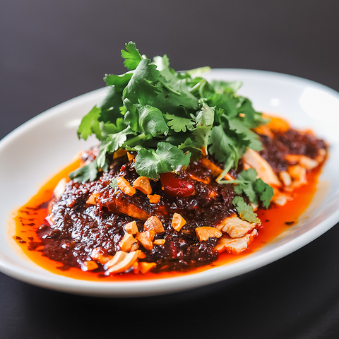 「思い出すだけでよだれが出る」と言われる四川料理の定番メニュー!しっとりと柔らかく仕上げた茹で鶏に、特製辣油とたっぷりのナッツ、パクチーを添えて仕上げました♪花椒の痺れる辛さと深いコクがクセになる味わいで、お酒のおつまみにもぴったりな一皿です!辛いもの好きの方には、ぜひ一度味わって頂きたい自信作です♪