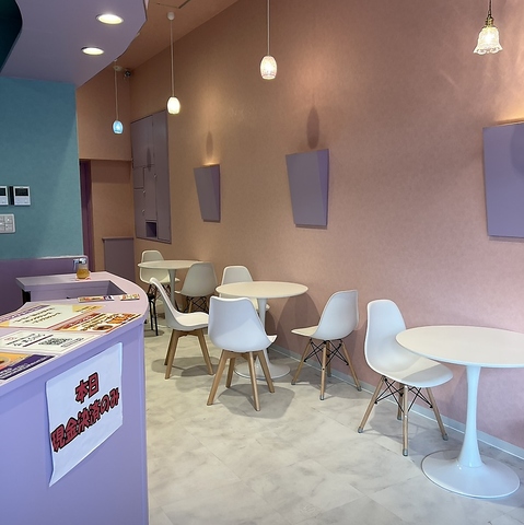 【かわいさに包まれる店内空間】女性が一人でも入りやすい、柔らかく可愛らしい雰囲気の店内。ピンクや水色を基調とした空間は、気分まで明るくしてくれます。写真映えも抜群で、カフェタイムが自然と楽しくなる居心地の良さが魅力です。