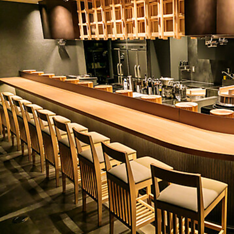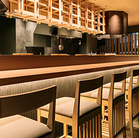 お一人様や二名様利用にも適したカウンター席は、奥行きと広さに余裕を持たせ快適性を重視♪職人の手さばきを間近に眺めつつ、臨場感と静寂の絶妙なバランスが魅力です◎暖かい照明と木の質感が心地良いスペースです。