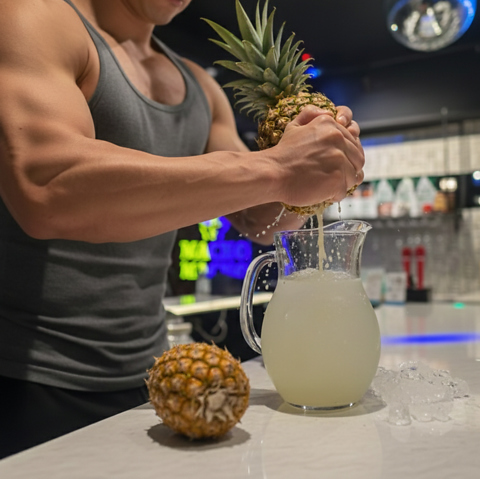 レモンサワーでは物足りないあなたへ。南国の恵み「パイナップル」を、マッチョが己の握力だけで豪快に絞りきる、当店最高峰のパワーメニューが登場!