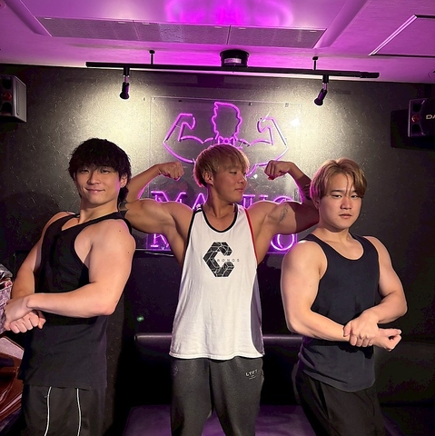 都会的なネオンが筋肉のカットを際立たせる、洗練された空間。重低音のBGMが宴のテンションを加速させます。