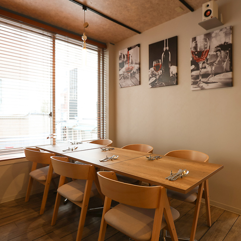 ゆったりと座れる6名様用のテーブル席は、家族でのお食事や仲の良い友人同士のお集まりにおすすめです。窓際の明るい空間で、リラックスしながら本格イタリアンを満喫。アクセス抜群な大街道駅近くの隠れ家的な雰囲気の中で、特別なランチやディナーを演出します☆