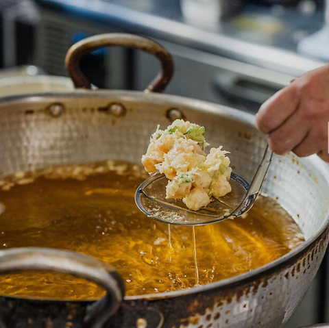 【サクサクの食感に、海の幸の旨みが凝縮】プリプリの海老と、甘みの強い小柱を贅沢に使用した特製かき揚げです。絶妙な揚げ加減で仕上げた衣のサクサク感と、噛むほどに溢れる魚介の旨みがたまりません。ボリューム満点ながら、素材の良さを活かした軽い口当たりでお酒も進みます。揚げたての香ばしさをお愉しみください。