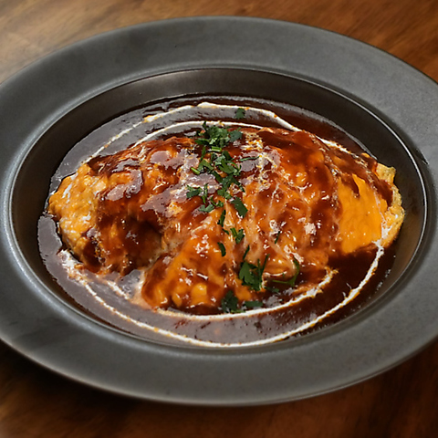 バター香るふわふわの玉子と、特製デミグラスソースのハーモニーがたまらない一品です。チキンライスはあえてすっきりとした味付けに仕上げており、最後まで飽きずにお楽しみいただけます。お子様連れのお客様にも大人気!赤ワインの深みが加わった本格派のソースは、一度食べたら忘れられない美味しさです。