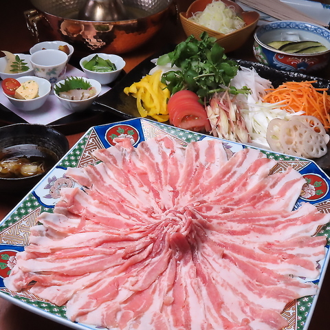 新鮮な能登豚のバラ肉に加え、バラエティ豊かな季節の野菜を石川県の地酒で味わえます。たっぷりのネギと柚子胡椒をつけて自家製つゆでご堪能ください。